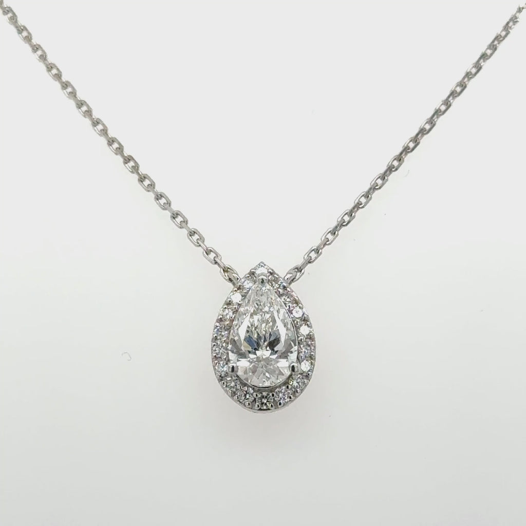 Elevate your style with this exquisite pear-shaped diamond halo necklace. Featuring a 1.02ct lab-grown central diamond, accented by 0.18ct of pave-set side stones, this piece captures light beautifully from every angle. Crafted in 18K white gold, the halo design enhances brilliance and creates a timeless, elegant silhouette.