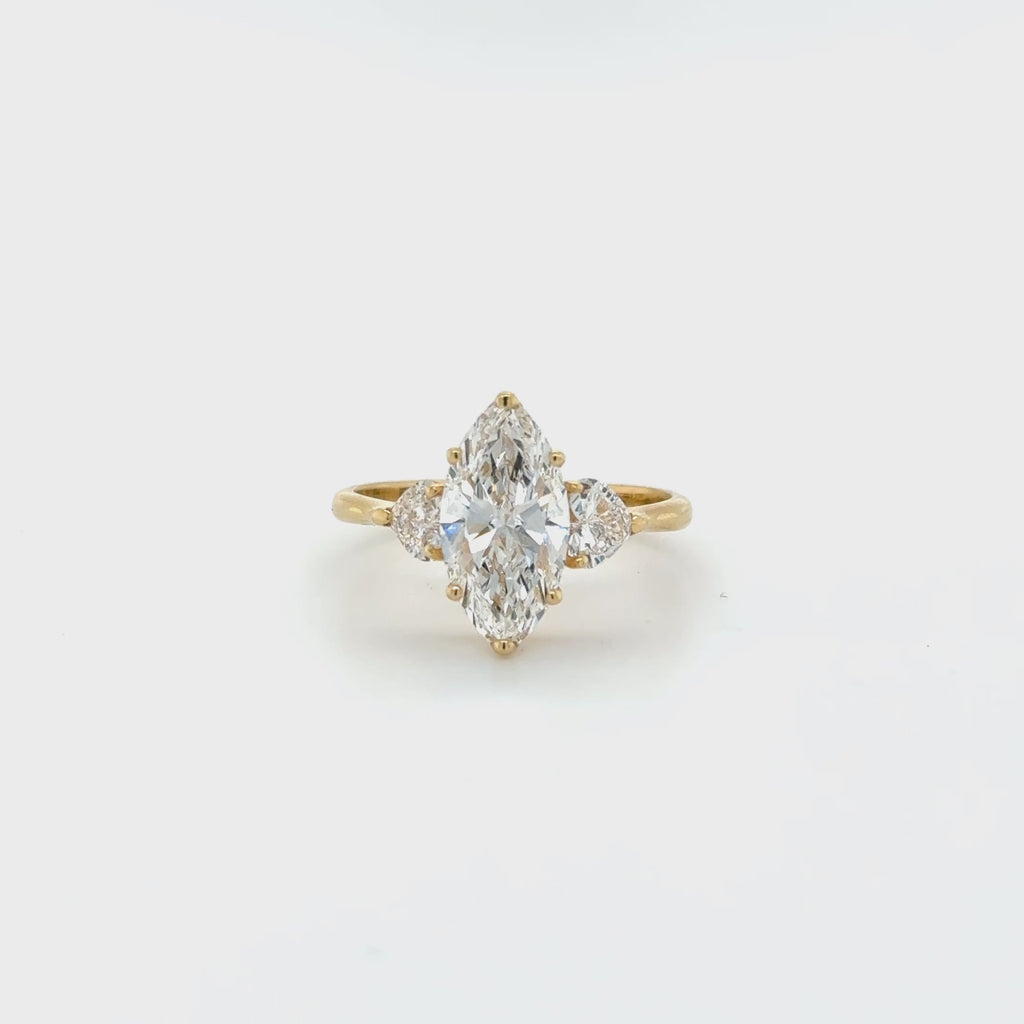 The Radiant Embrace Diamond Ring is crafted in warm 18K yellow gold and features a stunning 2.09 ct lab-grown marquise centre diamond. It is beautifully complemented by 0.45 ct of heart-shaped side stones, adding a romantic and distinctive sparkle. Graded E colour and VS1 clarity, this luxurious design combines bold elegance with refined sophistication, making it a truly captivating statement piece.