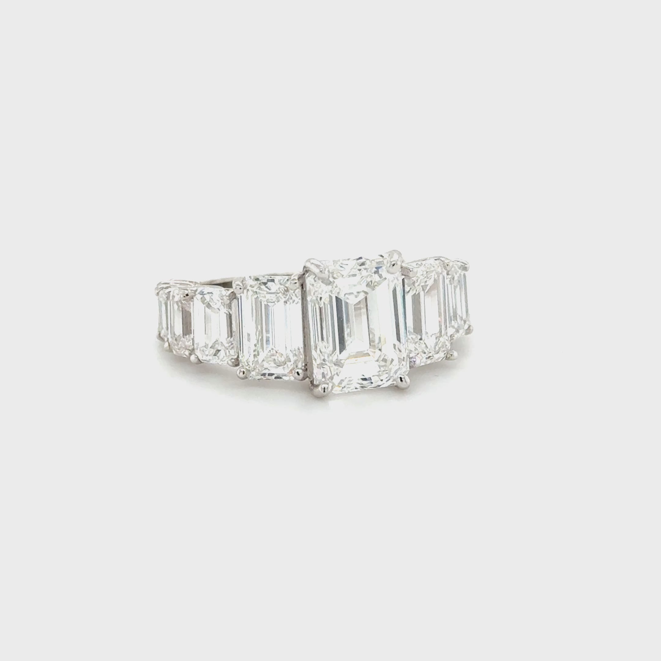 The Evelina Grace ring embodies timeless sophistication and luminous beauty. Featuring a breathtaking 3.02ct emerald-cut lab-grown diamond at its center, flanked by 5.32ct of degradé emerald-cut side stones, this exquisite creation radiates harmony, balance, and brilliance from every angle.